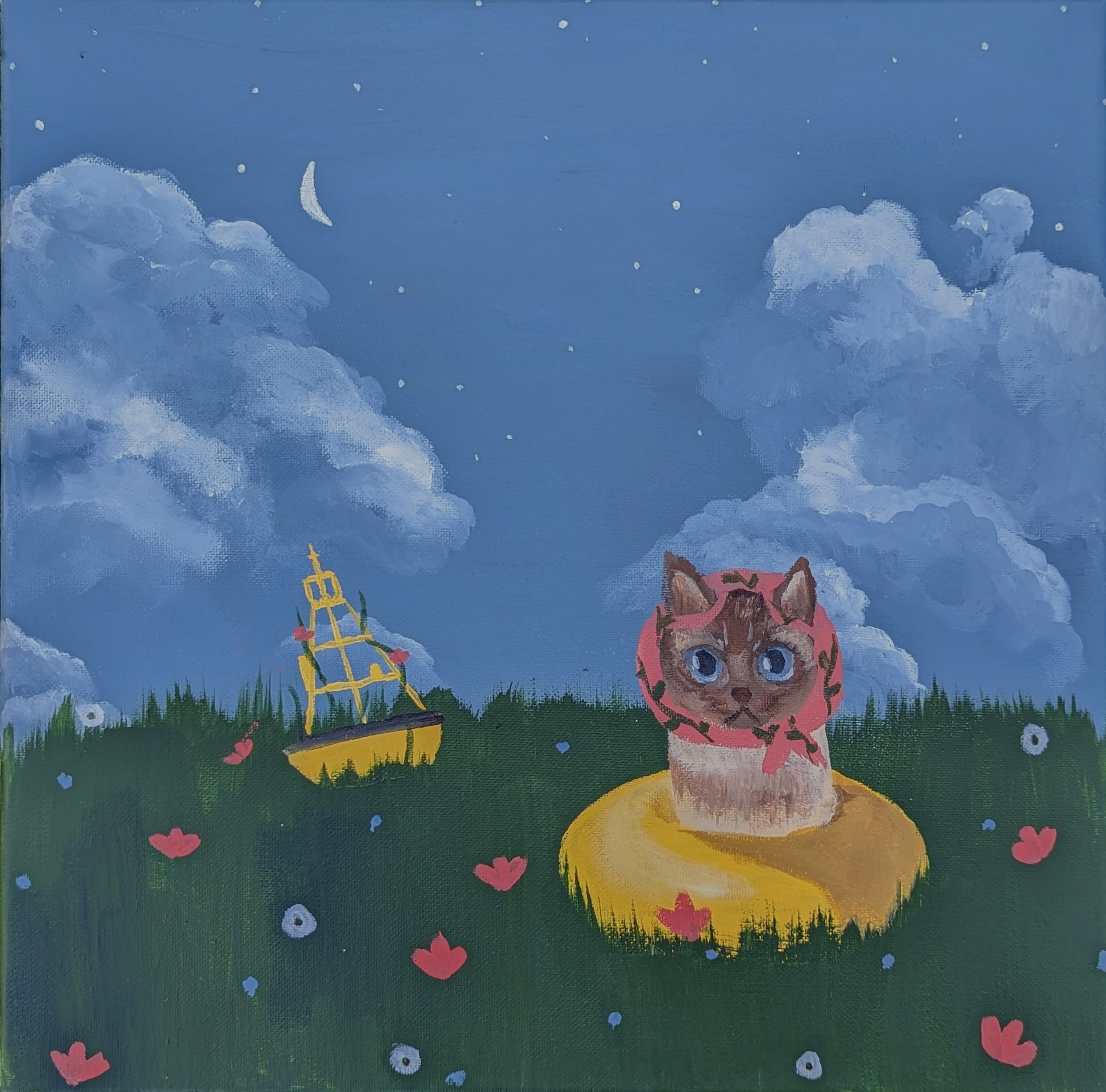 She floats through the fields in her little yellow tube, admiring the evening clouds.